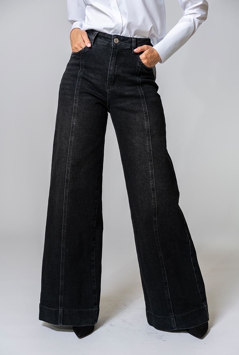 Material de calitate: Denim negru intens, ce păstrează forma și rezistă la purtare îndelungată.