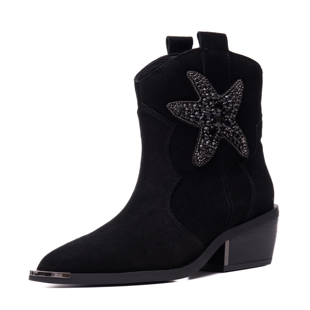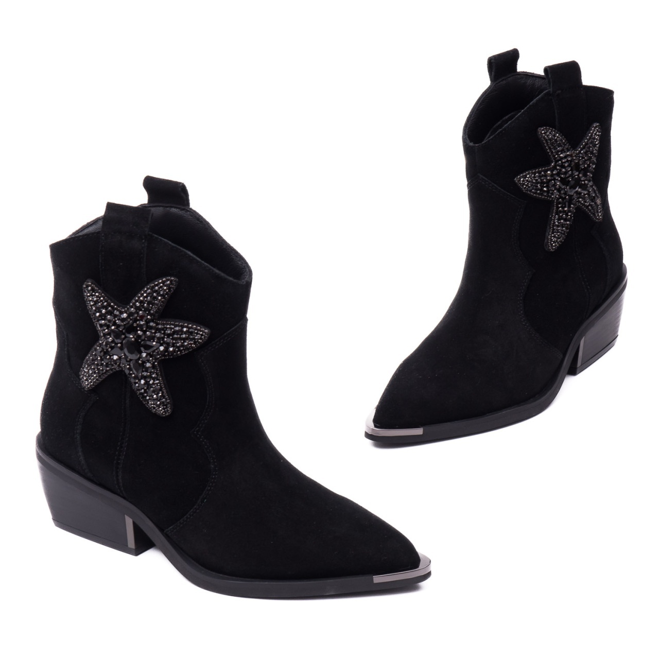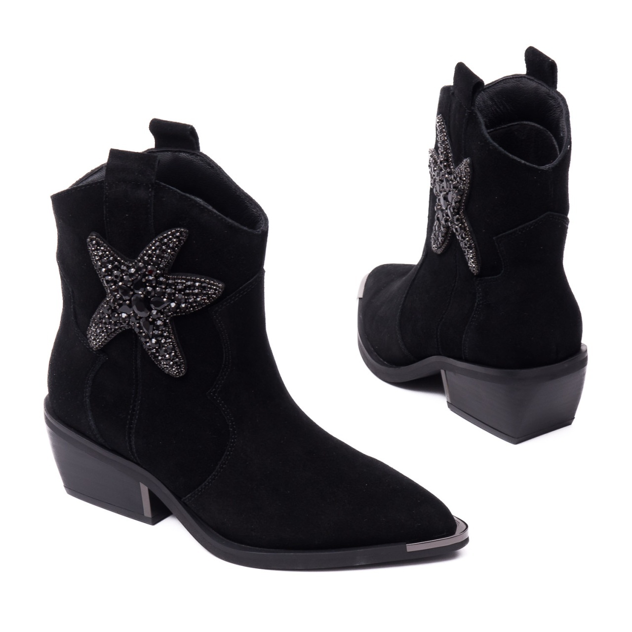 Botine Western Glam din Piele Întoarsă – Eleganță Îndrăzneață cu Accente Sclipitoare