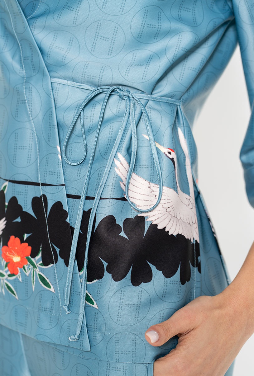 Realizată din satin imprimat, cu un croi suprapus fluid și sistem de prindere cu șnururi, cămașa îți permite să ajustezi lejeritatea după bunul plac. Mâneca trei sferturi este finisată cu mansete late, conturând o siluetă relaxată, dar elegantă, perfectă pentru zile în care vrei să fii remarcată.