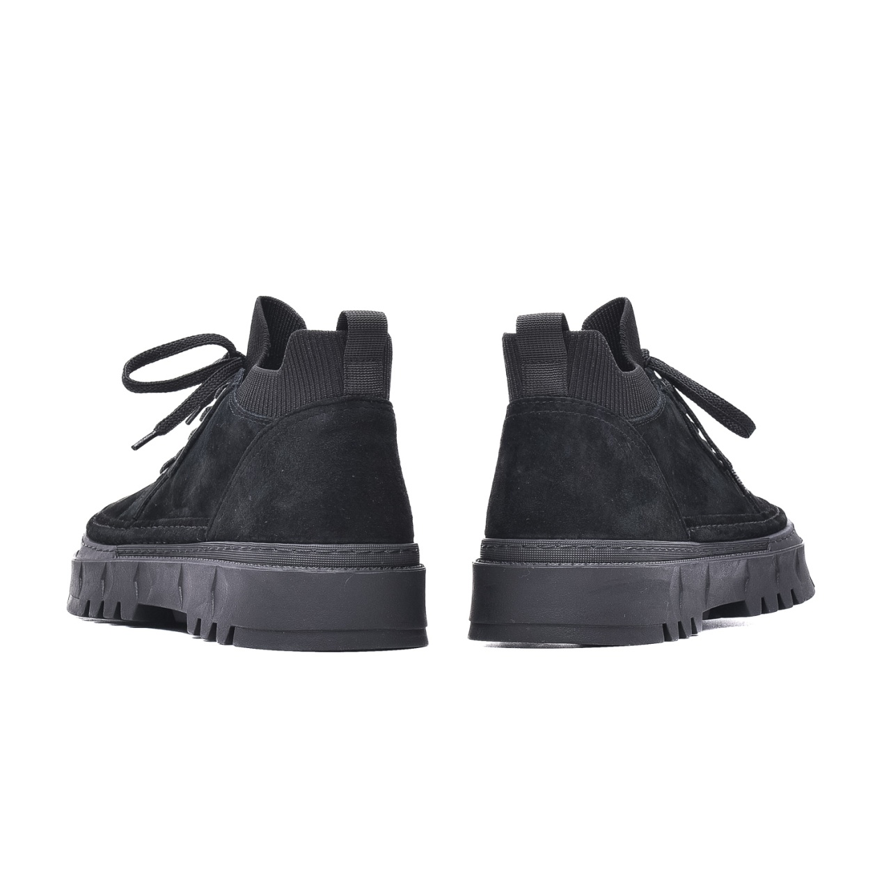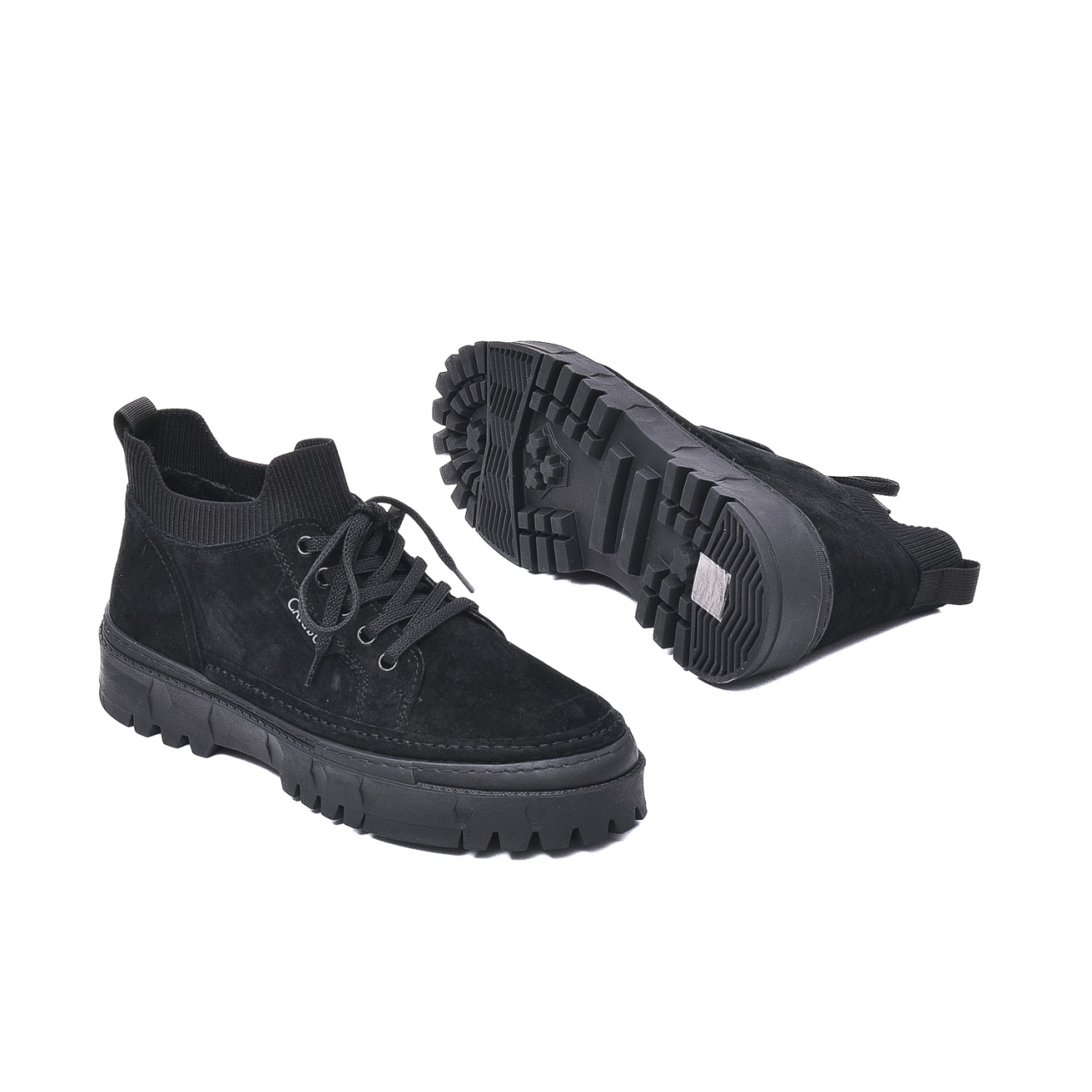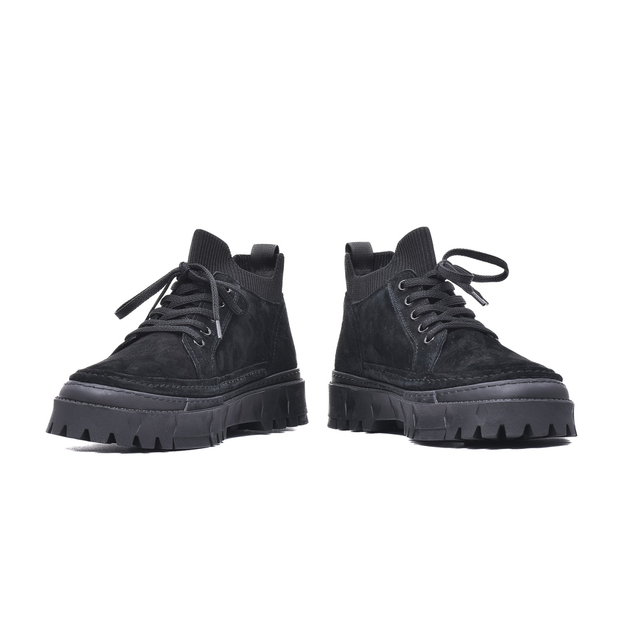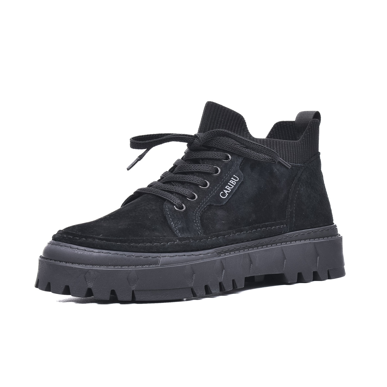 Ghete bărbătești cu guler textil elastic – Caribu Aceste ghete bărbătești de la Caribu oferă o combinație ideală între stilul modern și funcționalitate, fiind perfecte pentru sezonul rece. Realizate din piele întoarsă de antilopă, ghetele se remarcă prin textura fină și designul rafinat, aducând un plus de eleganță și confort garderobei tale de iarnă. Un detaliu unic al acestor ghete este gulerul textil elastic, care nu doar îți oferă un aspect modern și flexibilitate, dar contribuie și la un plus de confort în jurul gleznei, menținând piciorul bine susținut și protejat împotriva frigului. Căptușeala textilă și branțul îmblănit asigură o senzație plăcută și căldură în timpul purtării, fiind ideale pentru zilele reci de iarnă. Vârful rotund îți oferă libertatea de mișcare necesară pentru un confort sporit pe tot parcursul zilei. Închiderea cu șireturi permite o ajustare optimă, asigurând o potrivire perfectă și stabilitate în mers. Talpa groasă, cu striații special concepute pentru a asigura aderență pe zăpadă și gheață, este realizată dintr-un material termo-rezistent, oferindu-ți protecția necesară în fața condițiilor meteo dificile. Cu o culoare negru versatilă, aceste ghete sunt ușor de integrat în orice ținută casual sau semi-formală, fiind o alegere excelentă pentru bărbații care caută atât stil, cât și funcționalitate.