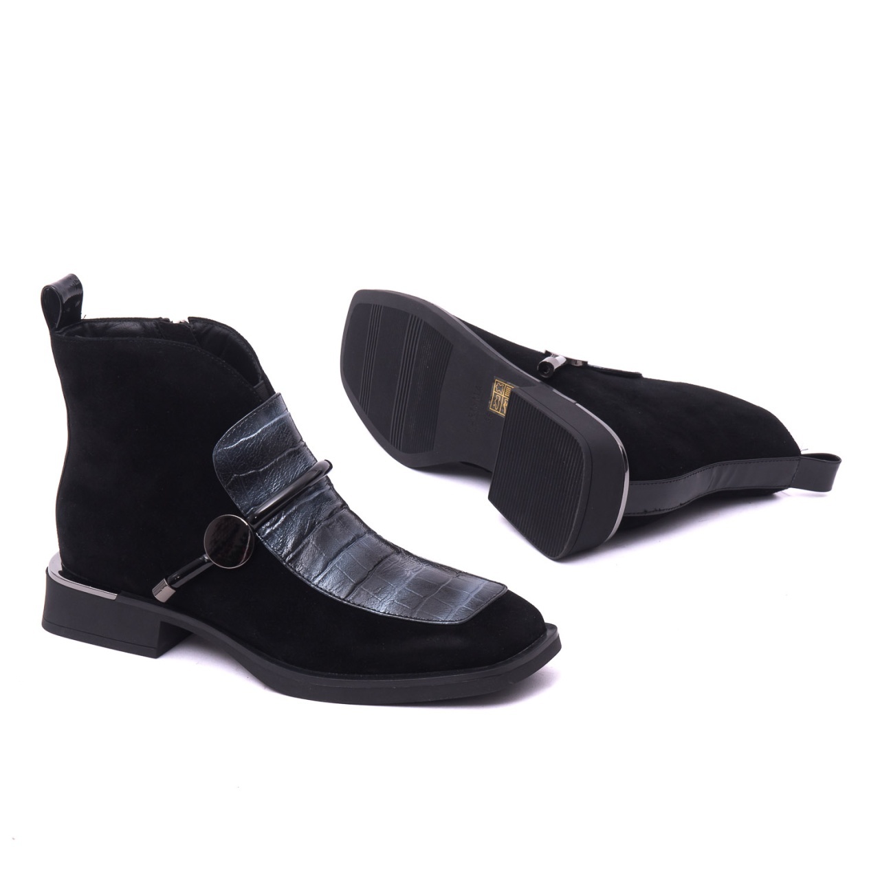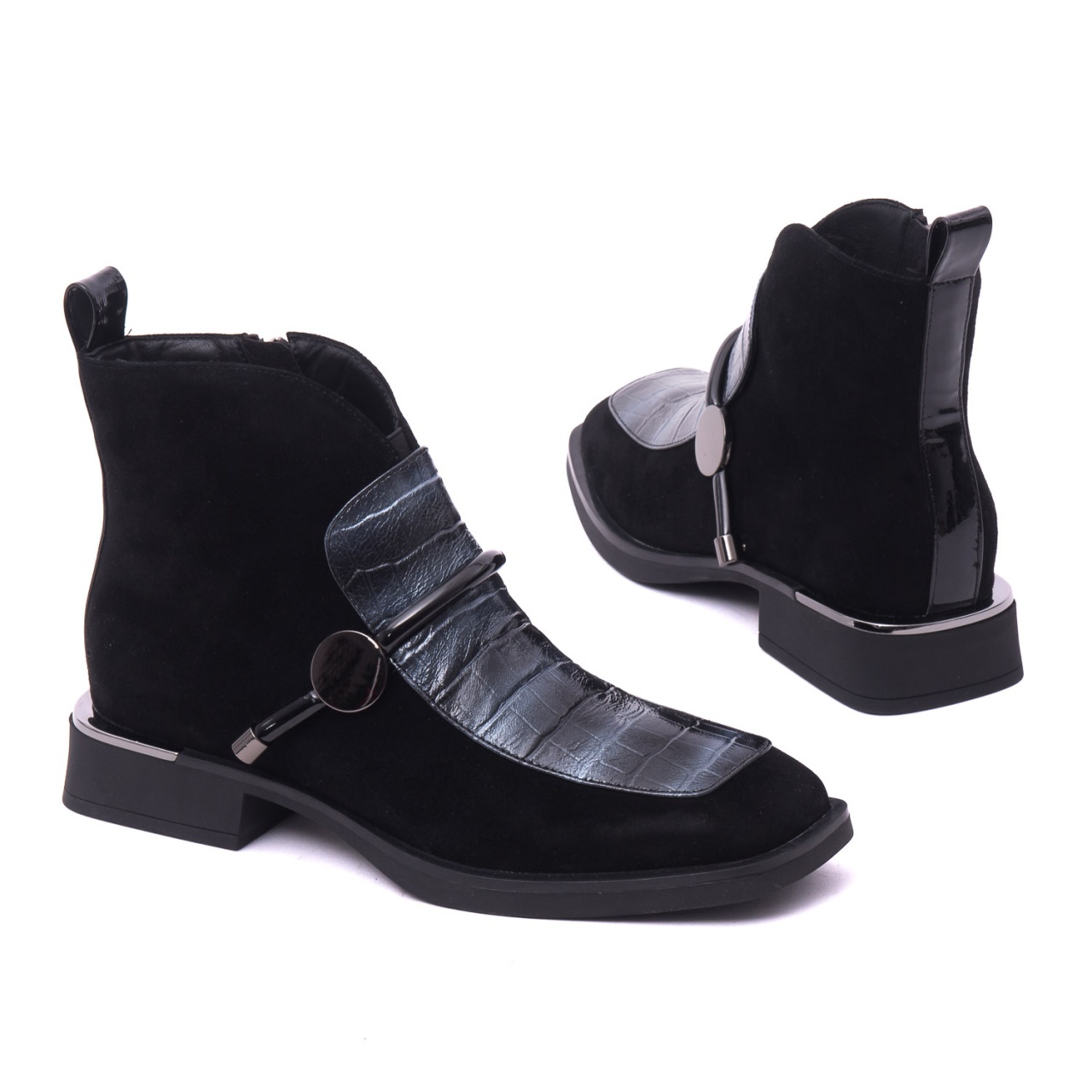 Material premium: Exteriorul combină pielea întoarsă naturală cu detalii lăcuite și piele ecologică croco, oferind un look sofisticat și actual.