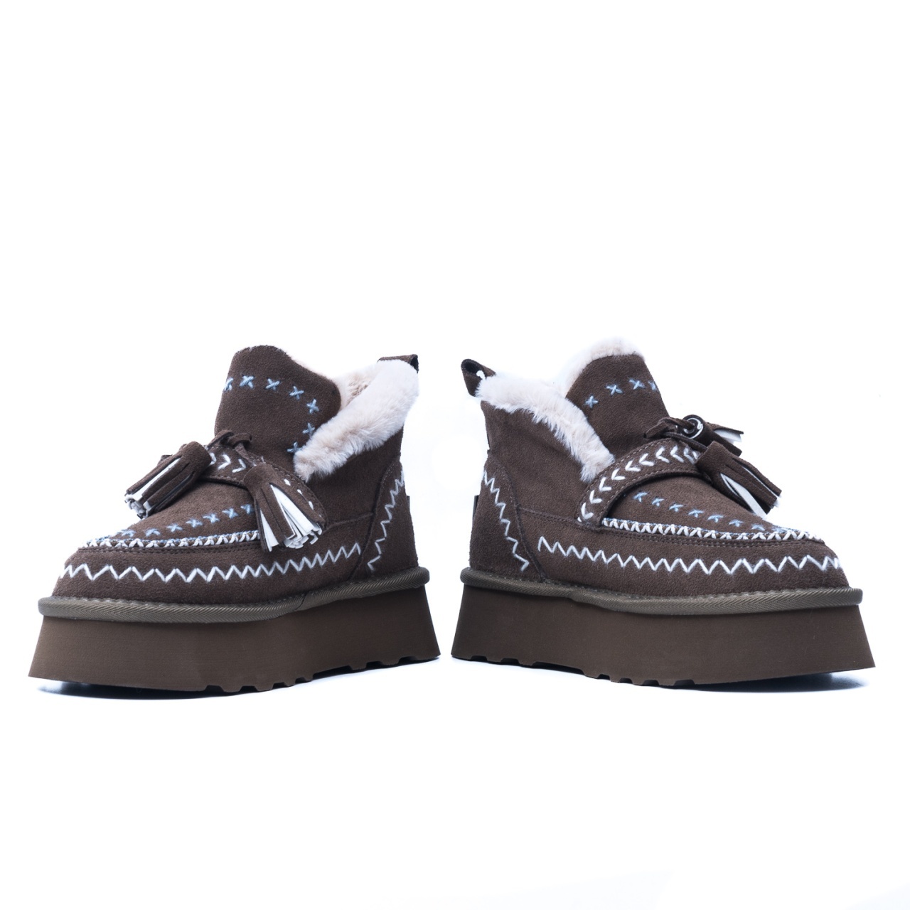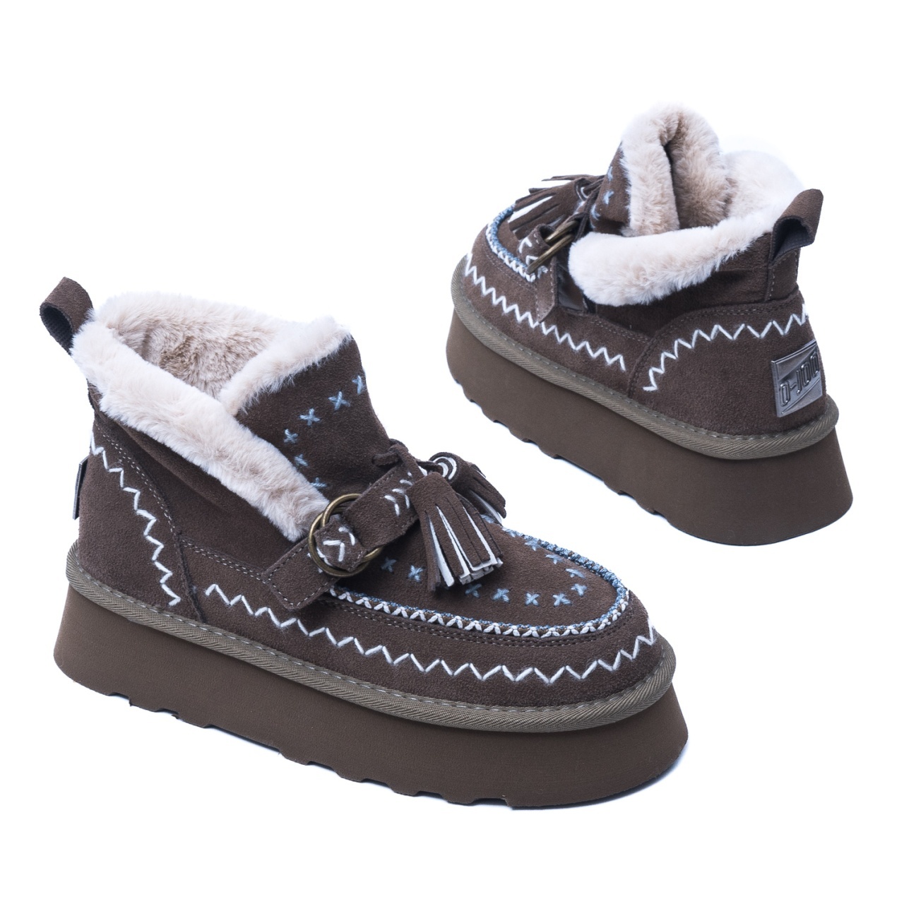Material premium: Piele întoarsă naturală, decorată cu cusături decorative albe și albastre, pentru un efect vizual distinctiv.