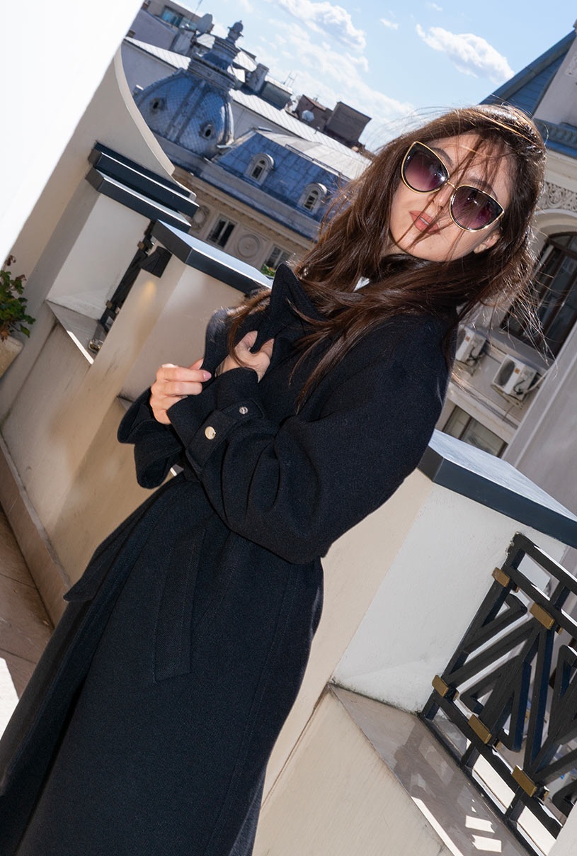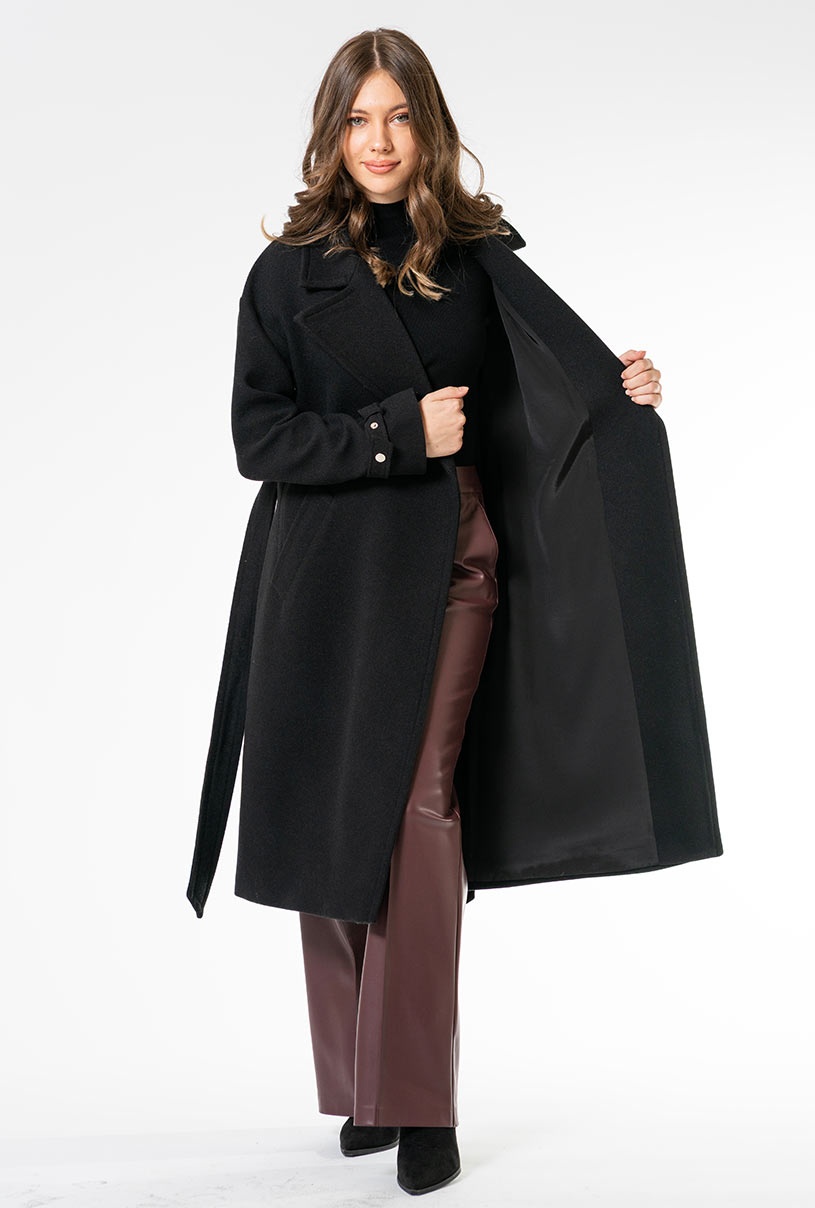 Acest palton poate fi purtat peste rochii, ținute office sau cu jeanși și pulovere. Reverele mari și cordonul accentuează silueta, iar șlițul la spate și manșetele reglabile adaugă confort.