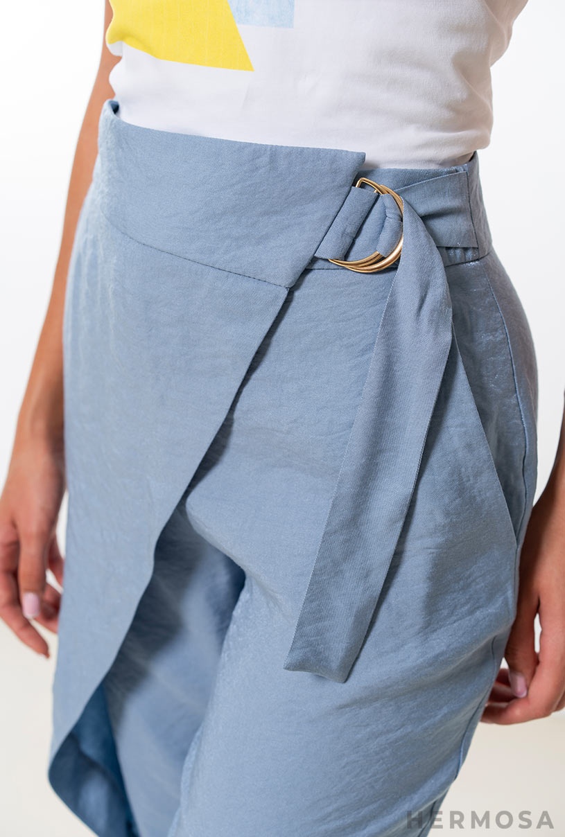 Pentru apariții îndrăznețe și rafinate, alege pantalonii bleu Zasha din rayon shine marca Hermosa. Acest model unic se remarcă prin croiul nonconformist care îți subliniază silueta și semi-fusta frontală, fixată cu o centură atașată pe betelie și o cataramă metalică laterală. Designul elegant și unic este completat de buzunarele funcționale, oferind atât stil, cât și practicitate. Închiderea frontală cu fermoar și nasture ascuns în betelie asigură un finisaj impecabil.
